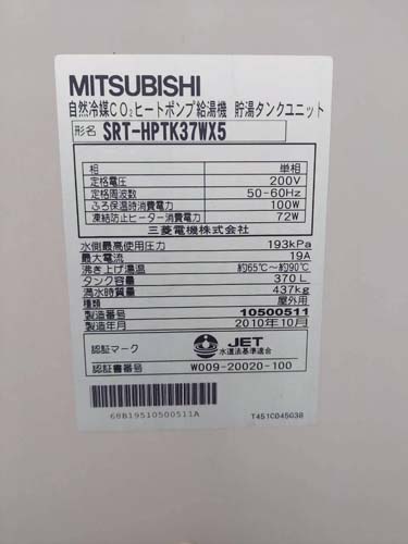 川崎市中原区 三菱電機自然冷媒CO2ヒートポンプ給湯機 貯湯タンクユニットSRT-HPTK37WX5→コロナ自然冷媒CO2家庭用ヒートポンプ給湯機 貯湯ユニット CTU-37AZ1K エコキュート交換工事