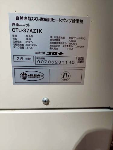 川崎市中原区 コロナ自然冷媒CO2家庭用ヒートポンプ給湯機 貯湯ユニット CTU-37AZ1K エコキュート交換工事
